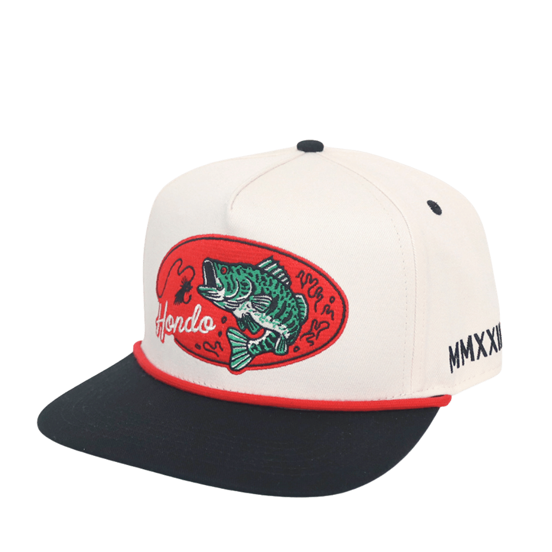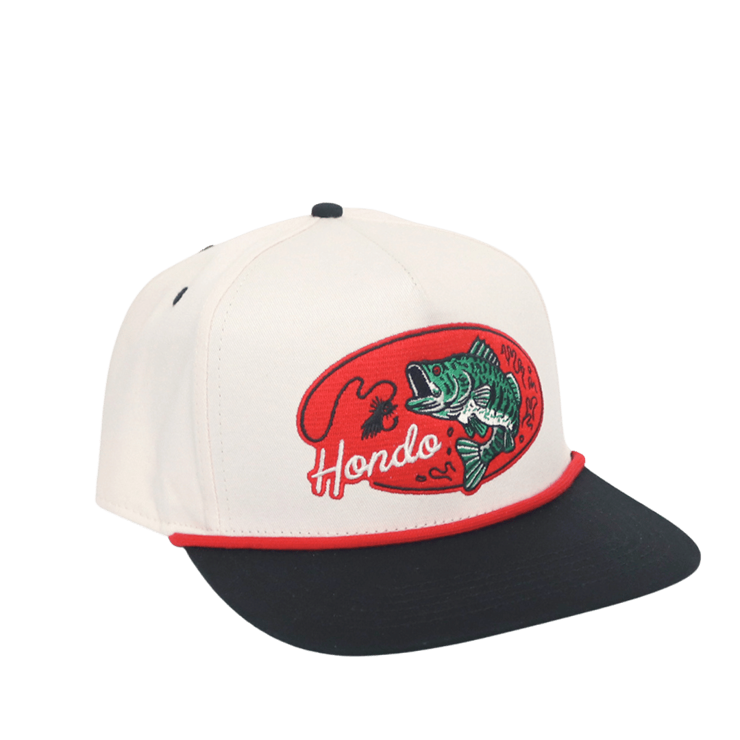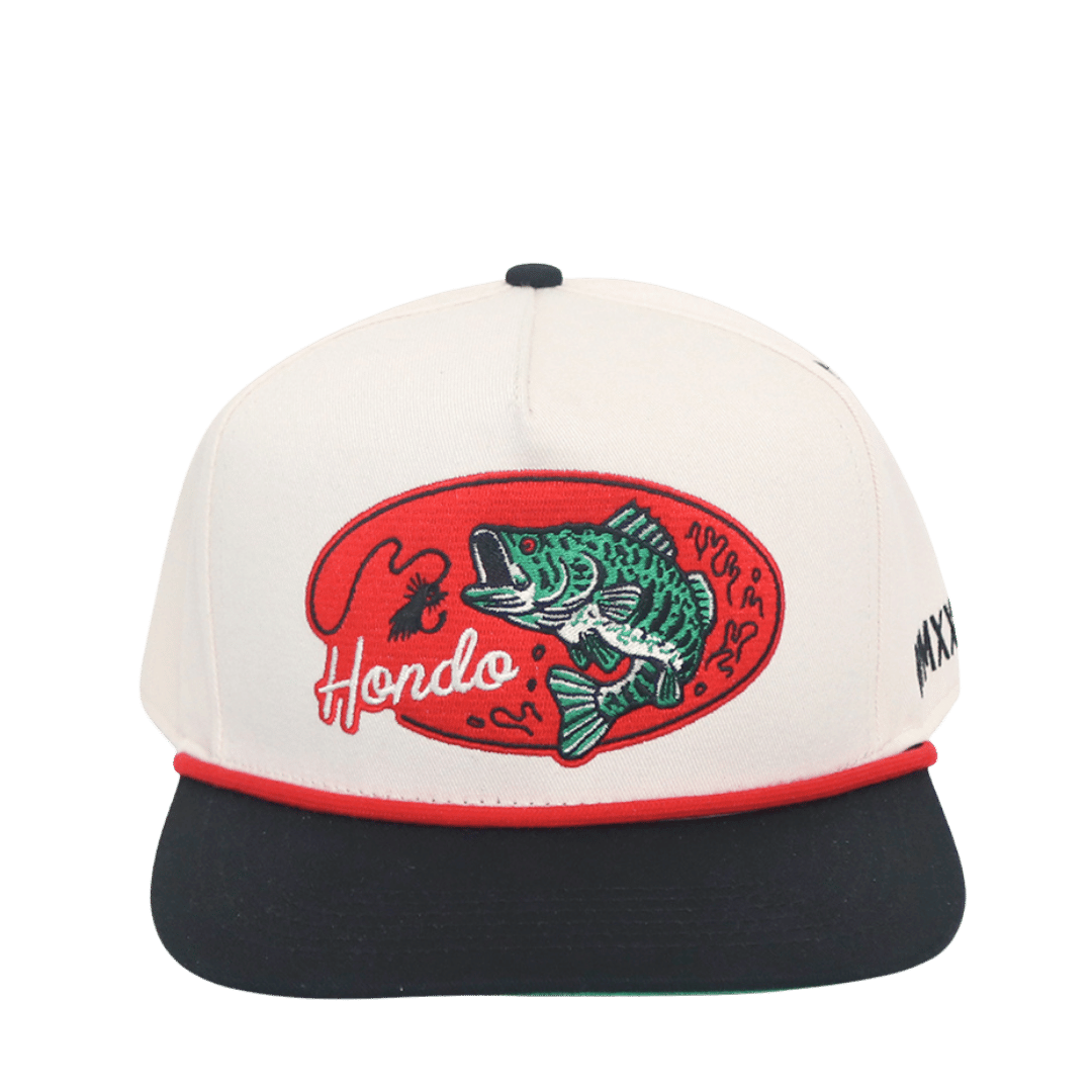 Introducing the "Lunk" — a bold tribute to the ones that got away. Featuring a cream crown, black brim, and a vintage green underbrim, this hat brings old-school fishing style back to life. The red rope and two-tone embroidery pop with classic energy, framing a massive embroidered bass front and center — the kind of “lunker” every angler dreams about. Built with premium materials and that unmistakable Hondo craftsmanship, The Lunk is made for long days on the water and good times off it.